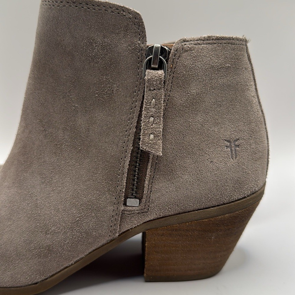 FRYE Judith Bootie in Taupe Suede Double Zip Stack Heel Size 7 Specs